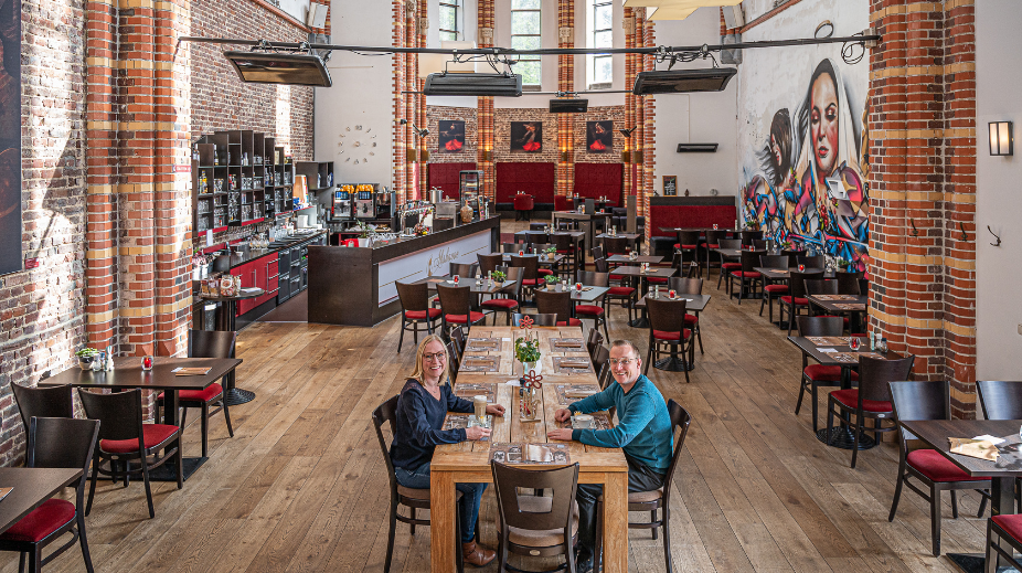 Brasserie and Restaurant Abshoven, the attractive catering business of Tessa and Bram Vos, is located in an old monastery church in South Limburg. Guests can come here for homemade cakes, lunch, high tea, dinner and a friendly atmosphere. “We receive large groups and many regulars from the neighborhood,” says Tessa. She and her brother, Bram, embarked on the entrepreneurial adventure eight years ago. “And it’s going really well, we’ve gone from 160 seats inside and outside to 270.”